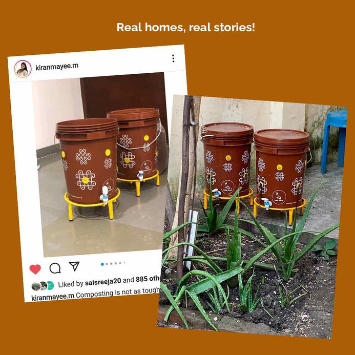 | Contents | 1 Bin with lid + tap + separator + 2 washers + 1.5 kg Remix Powder + Compost Microbes + Neem Powder + Gloves + Instruction sheet |
