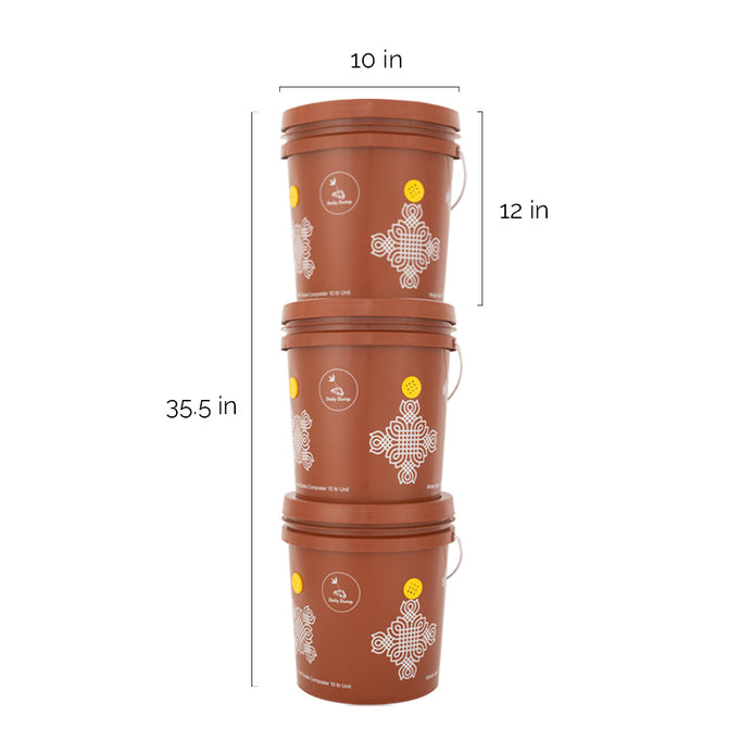| Dimensions (inches) | Gobble Duo, Gobble Trio & Gobble Senior Each Unit 10"H * 12" Dia | 15 litres per unit Gobble Junior Each Unit 12.5"H x 10" Dia | 10 litres per unit |