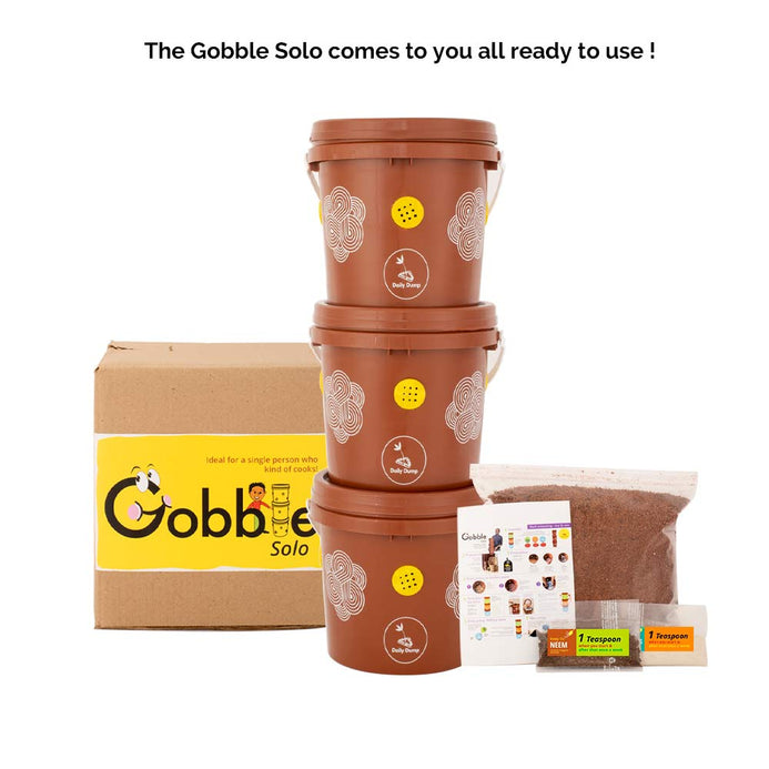 Do the messy garbage piles on our roads trouble you? If you live alone and don't cook much, the Gobble Solo 3 tier aerobic home compost bin is designed for you. Light, compact, smell-free and so easy to use - you can even use it on your kitchen counter! Paired with a Chomp or Leave-it-Pot, this Gobble Solo will help a single person manage kitchen waste comfortably for life! Each unit of Gobble Solo has a 3kg capacity.