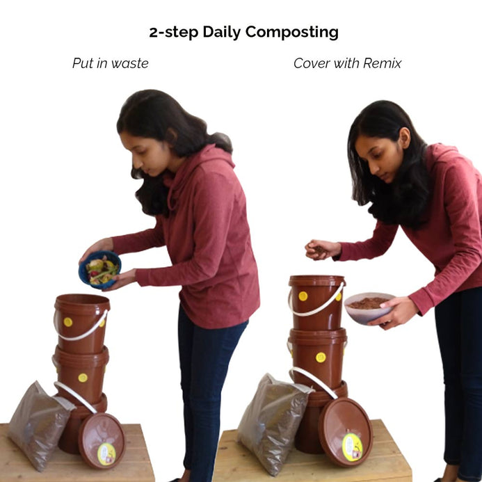 - Layer kitchen waste with Remix Powder daily for odour-free, fool proof composting.