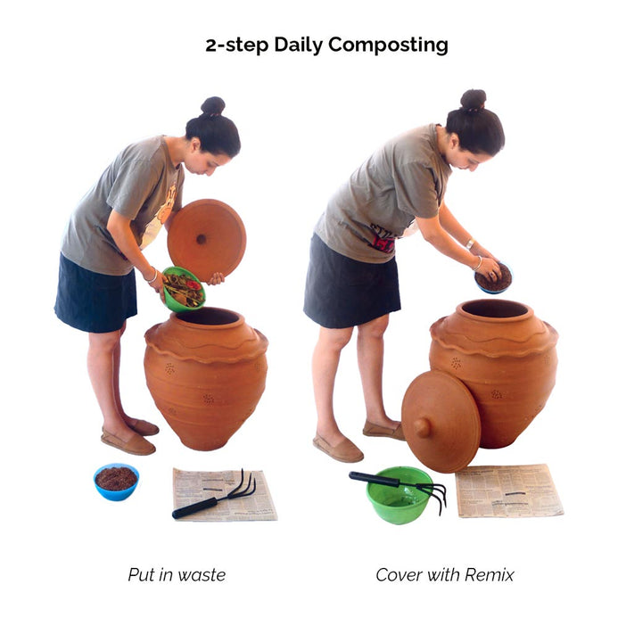 - Layer your kitchen waste with Remix Powder daily, for smell free and fool proof composting.