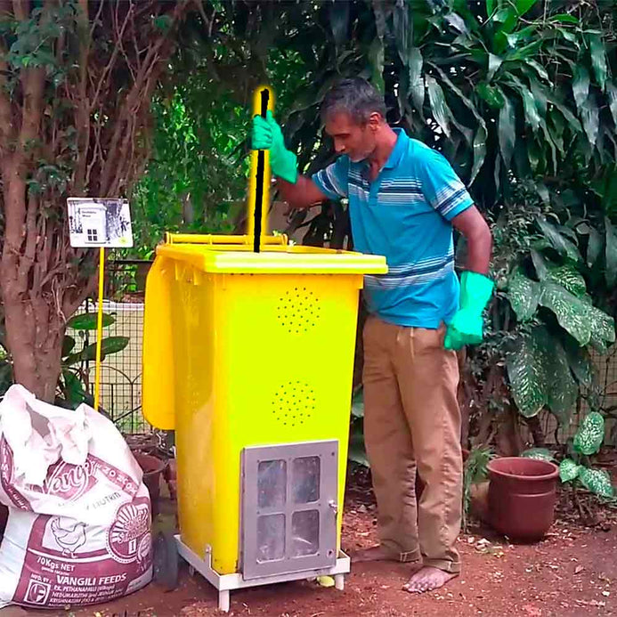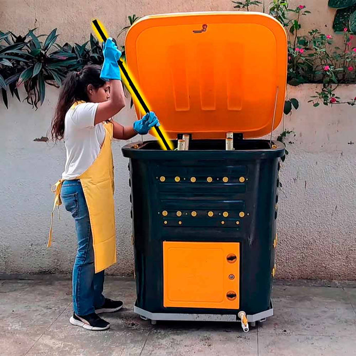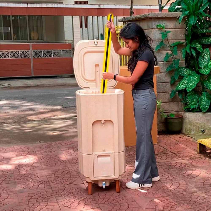 In the Gobble Mini, Gobble Max, Terrabite, Gaia, Aaga or Leaf Composters once the compost is harvested, the waste needs to be pushed down from the top. This will create space for fresh waste from above. The Presser Rod helps you push this waste down in a no-fuss, no-hassle way! Made of mild steel pipe and sheet, the Presser Rod is powder coated and sturdy. It has a hole on the handle for you to hang conveniently.