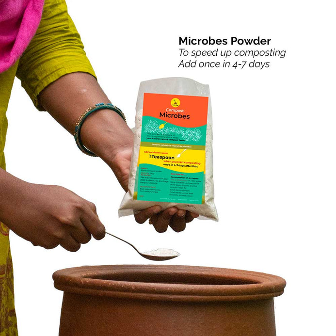 - Add 1 teaspoon of microbes and neem once a week to the pile