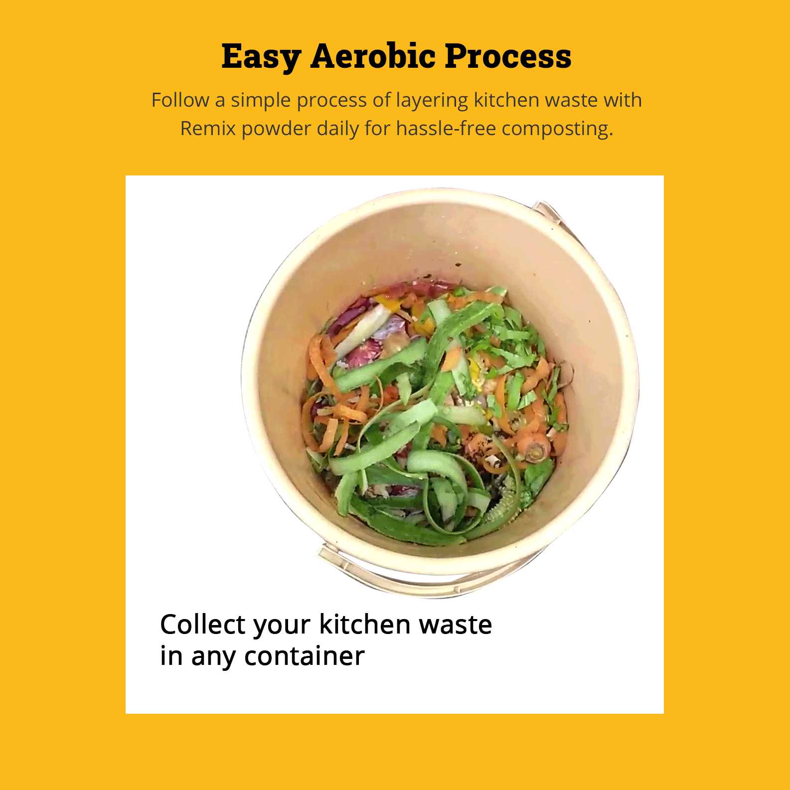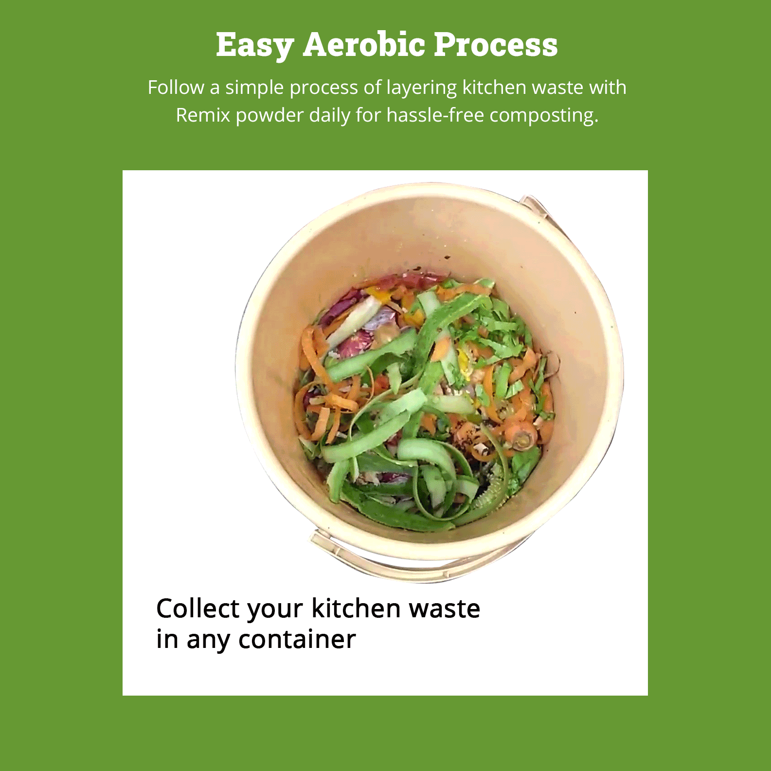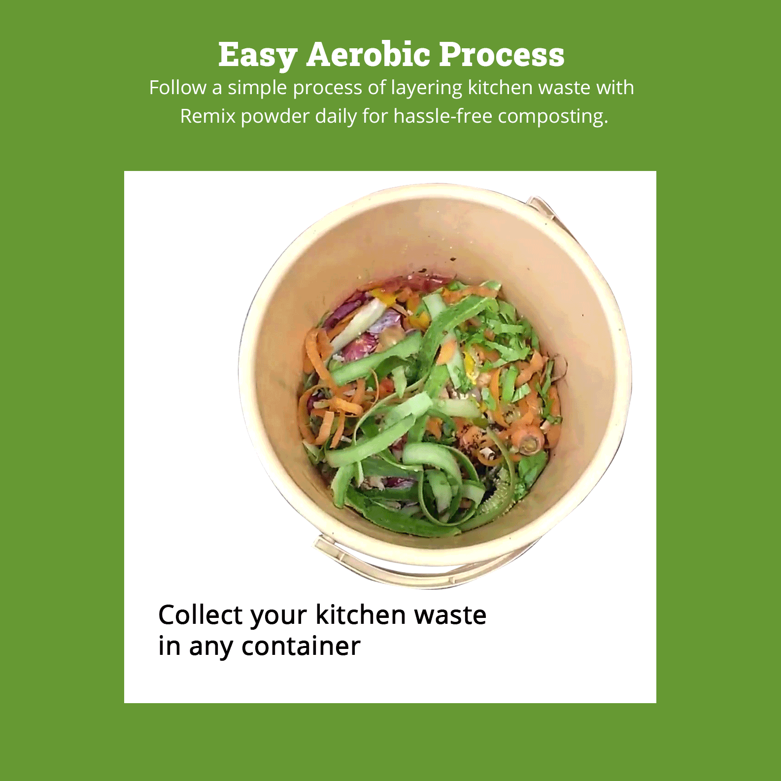 - Layer your kitchen waste with Remix Powder daily, for smell free and fool proof composting.