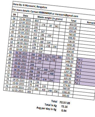 Dear All, I am using the Kambha for last year to com-post the wet waste. I am very much happy, could able to compost all wet waste without sending bbmp/landfill. I am giving thhom-post to my neighbours who are required for their gardening. I have measured the wet waste weight which is generated from my home for past two and half months. I have attached the full details for your reference. This was my interest to know the average waste weight from my home. This can be used for statistics purpose. I would like to thank my wife who has supported to do this. Please let me know your feedback whether it can be useful data for you. 1st June 2015