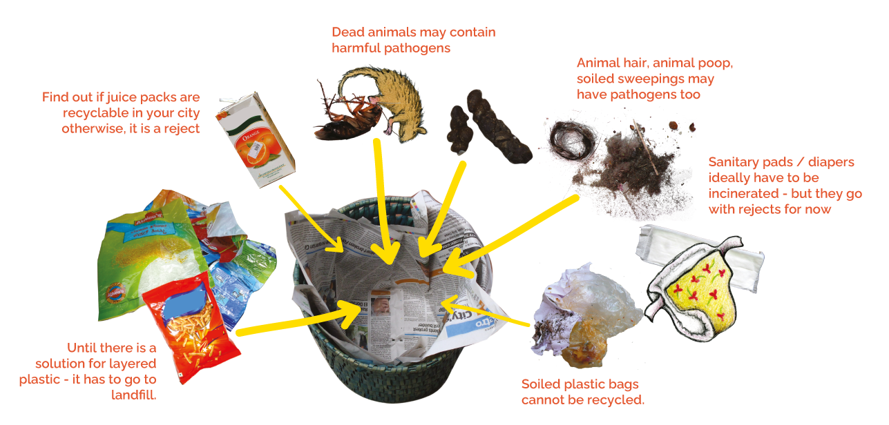 soiled food packets, broken glass and sharp objects may hurt or harm a recycler - these can go with rejects, wrapped well in newspaper.