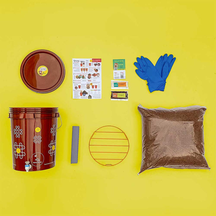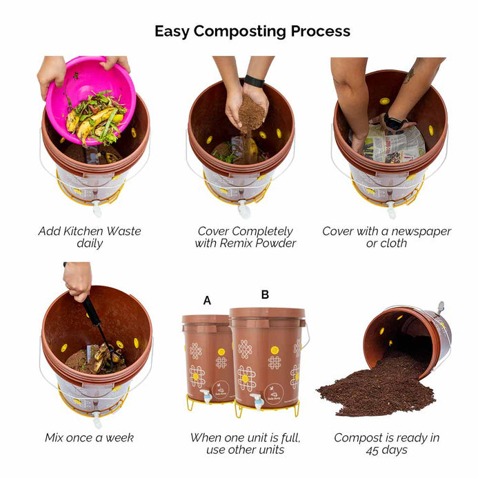 | Contents | 1 Bin with lid + tap + separator + 2 washers + 1.5 kg Remix Powder + Compost Microbes + Neem Powder + Gloves + Instruction sheet |
