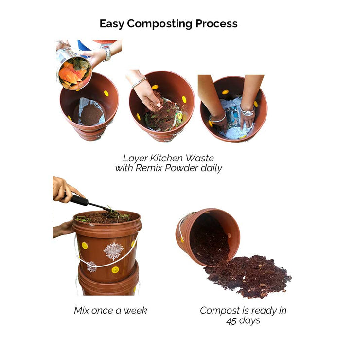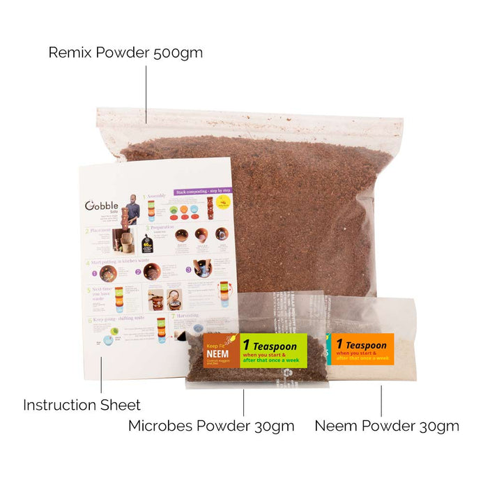 | Contents | 3 units with lids + 350 gm Remix Powder + Compost Microbes + Neem Powder + Instruction sheet |
