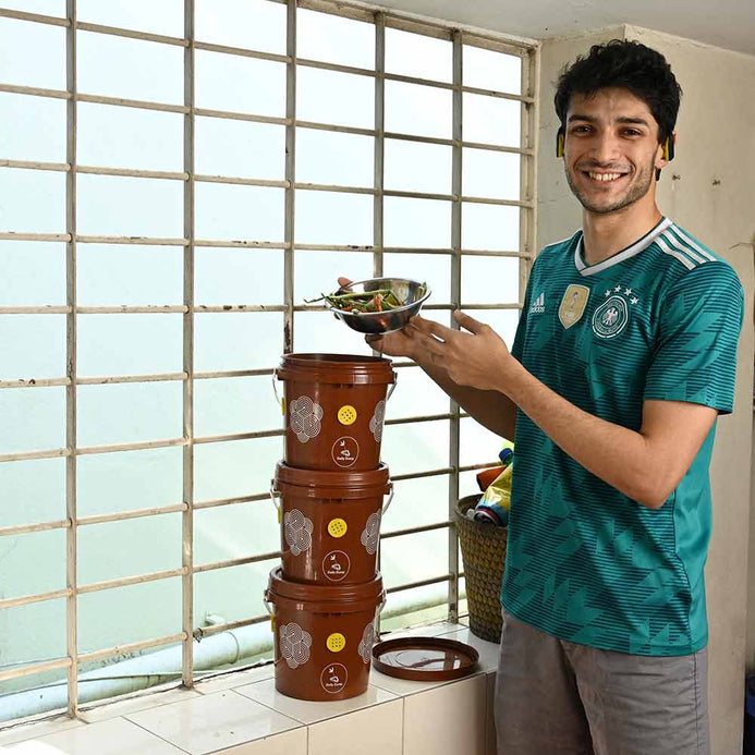 Do the messy garbage piles on our roads trouble you? If you live alone and don't cook much, the Gobble Solo 3 tier aerobic home compost bin is designed for you. Light, compact, smell-free and so easy to use - you can even use it on your kitchen counter! Paired with a Chomp or Leave-it-Pot, this Gobble Solo will help a single person manage kitchen waste comfortably for life! Each unit of Gobble Solo has a 3kg capacity.