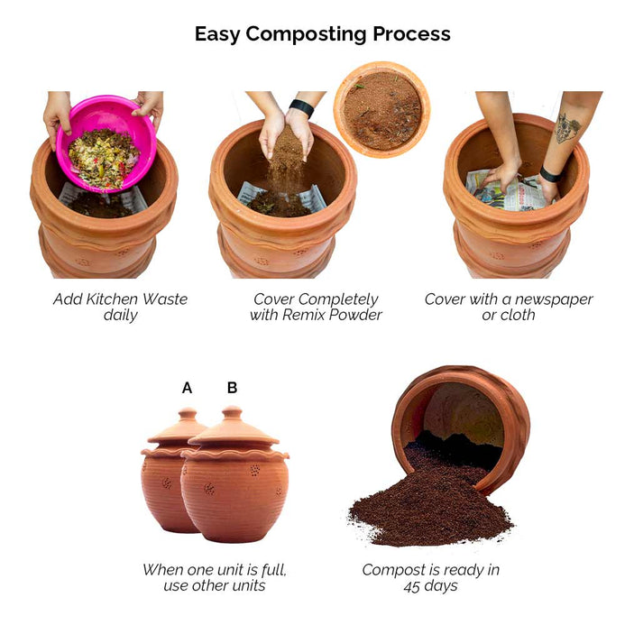 - Layer your kitchen waste with Remix Powder daily, for smell free and fool proof composting.