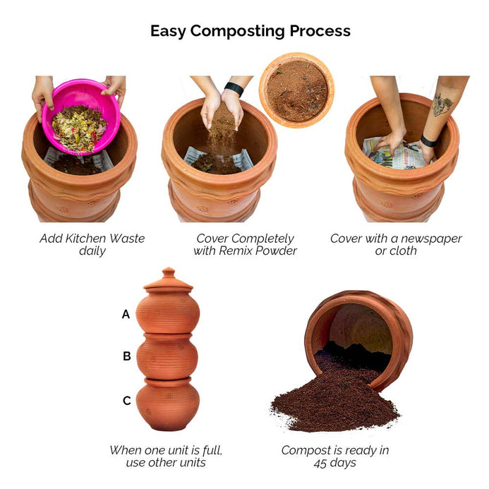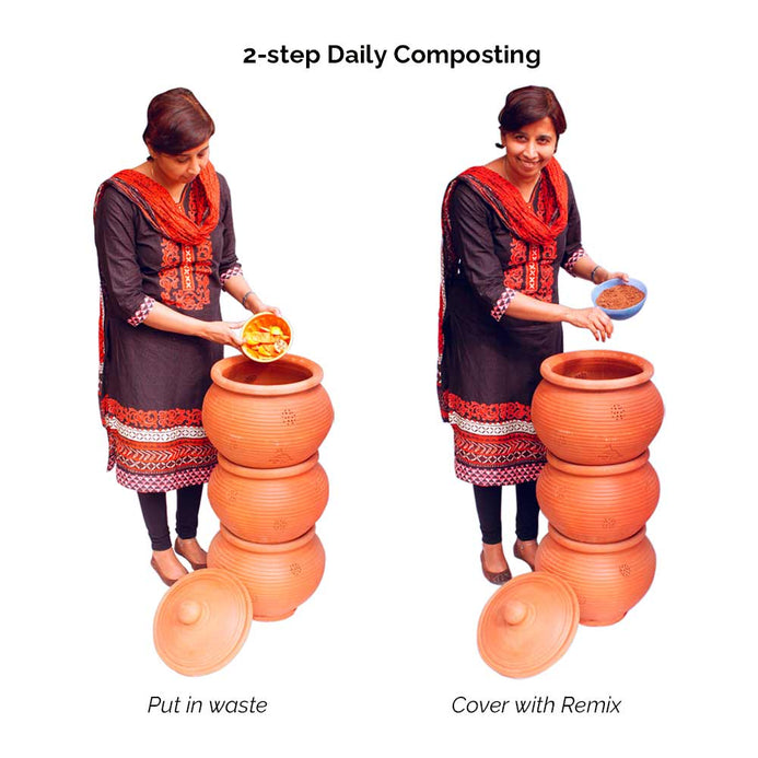 - Layer your kitchen waste with Remix Powder daily, for smell free and fool proof composting.
